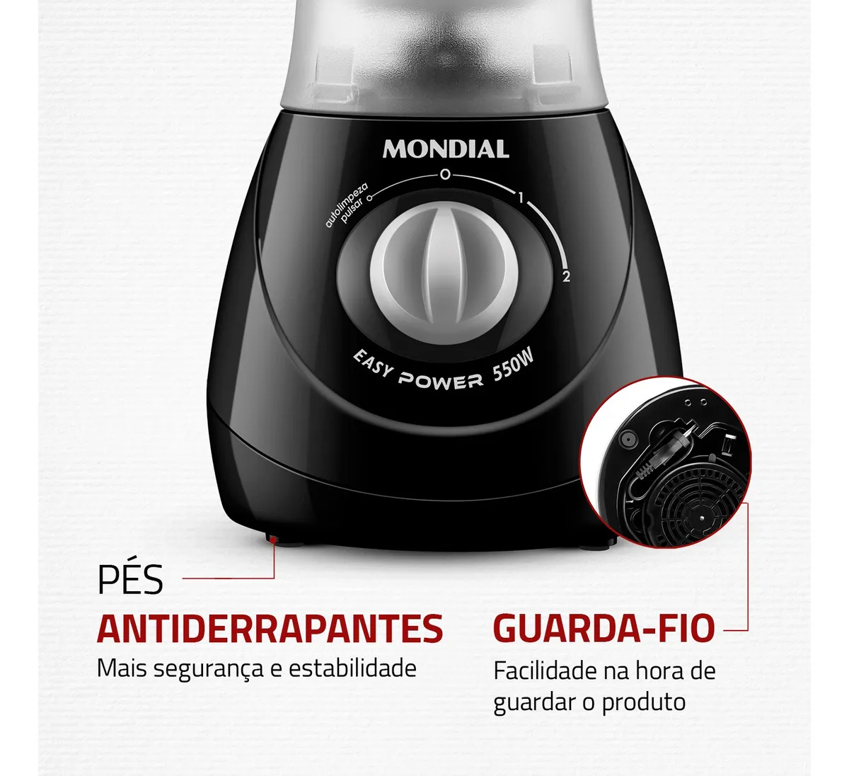 O liquidificador Mondial Easy Power 550W é um aliado na rotina na cozinha. São 550W de potência, capacidade total de 1,9 litros, além de 2 velocidades + Função Pulsar, que tritura até ingredientes mais duros. Você pode preparar torta de frango, bolo de milho, pão de queijo, massa de panqueca, queijadinha e muitas outras receitas com praticidade e rapidez. Saiba mais sobre o L-550-B: POTÊNCIA: 550W Permite que você misture ou triture suas receitas com maior agilidade. CAPACIDADE* TOTAL: 1,9 LITROS Prepare sucos, vitaminas, smoothies, molhos e diversos outros pratos na porção ideal que você precisa! *Capacidade Útil de 1,5 Litros. RESISTENTE A QUEDAS E RISCOS O copo dos liquidificadores Mondial é super-resistente e garante mais durabilidade para seu aparelho. LÂMINAS EM INOX Trituram com mais precisão e rapidez. Além disso, não enferrujam e são mais duráveis. 2 VELOCIDADES + PULSAR Escolha a velocidade ideal para alcançar a textura perfeita! Dica: a função Pulsar tritura ingredientes mais duros. FUNÇÃO AUTOLIMPEZA Higienização rápida e prática do seu liquidificador. JARRA: BPA FREE + SEM CHEIRO O material não contém Bisfenol-A, que é nocivo à saúde, e não deixa cheiro. GUARDA-FIO E PORTA PLUG Aviso legal • Livre de BPA.